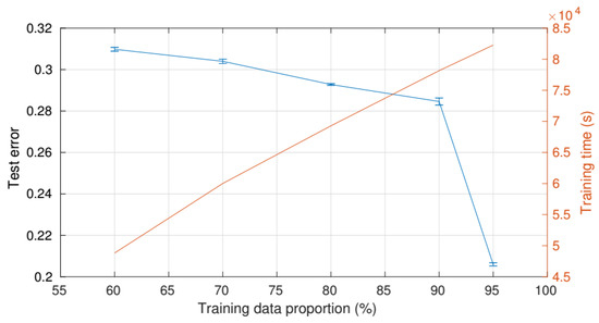 Figure 4. The relationship between the test error and error bars, training time, as well as training data proportion.