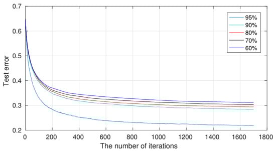 Figure 3 shows the iterative relationship between the test error and the various training data ratios. All curves tend to converge after 1600 iterations, further demonstrating that a greater test data ratio may effectively reduce the test error.