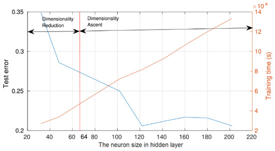 We can see from Figure 4 that in the first stage (0–120), the test error decreases as the number of neurons increases. While in the second stage (greater than 120), the test error is around 0.21, and it slightly fluctuates. At the same time, there appears to be a linear relationship between the training time curve and the number of neurons. Although the difference between the test error curve and the training time curve reaches a minimum of about 100 neurons, the test error is still large. The test error reaches the minimum number of neurons, 121, and the training time is acceptable.