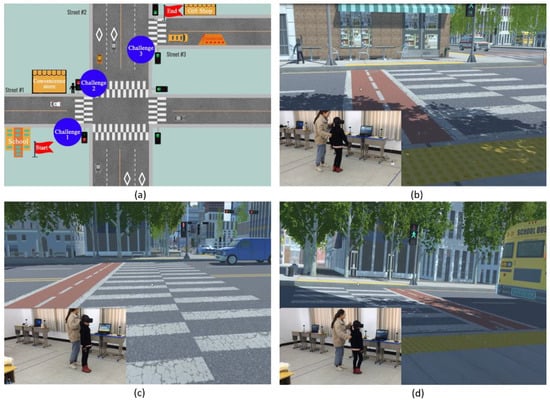 Figure 1, participants needed to complete three challenges at the three intersections designed in the IVR program: (1) When an avatar friend on the opposite side beckons the participant to join him, the participant needs to choose whether to cross the street immediately or wait for the next green light to cross at the pedestrian crossing (C1); (2) participants need to correctly interpret the meaning of a flashing green pedestrian light and make decisions regarding whether to cross a wide street (C2); (3) when the pedestrian light is green but a backing school bus is ready to drive away, the participant needs to choose whether to continue crossing the street or to wait for the bus to leave (C3). To successfully accomplish the three pedestrian challenges, participants need to demonstrate five correct pedestrian behaviors: B1—do not dash into the street; B2—cross the street when the pedestrian light is green; B3–when the pedestrian light is blinking green, do not cross the street when at the sidewalk or quickly cross it when in the middle of the crosswalk; B4—exam the incoming traffic when crossing the street; B5—be alert to the backing vehicle and give it priority over traffic light for safety.