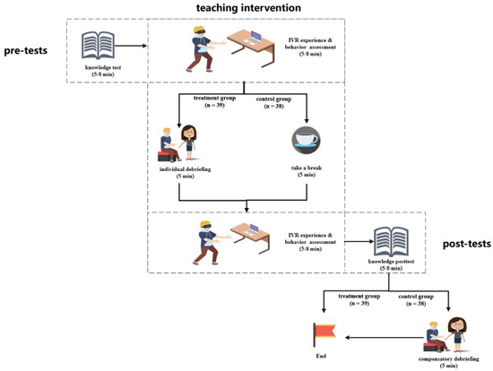 The study employed a two-factor mixed experimental design to examine the impact of IVR on children’s learning performance and the moderating effect of the proposed debriefing strategy. The internal factor tested was time (before and after the IVR-based instruction), and the within-subject factor tested was the intervention (debriefing and no debriefing strategy). The experimental process consisted of four phases and six activities as shown in