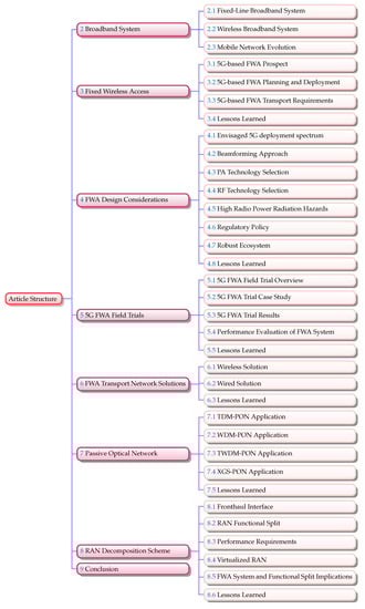 Having introduced the need for broadband service delivery at fiber-like speeds with low latency and the importance of the 5G technological enhancements in achieving the object, we present a comprehensive overview of the broadband system considering fixed-line and wireless broadband technologies in Section 2. In the section, we offer broad descriptions of different typical architectures along with network evolution in view of the technology types and the associated features. Moreover, Section 3 presents FWA and emphasizes the 5G-based FWA prospect, transport requirements, as well as planning and deployment. Furthermore, Section 4 presents different FWA design considerations and challenges that should be noted in the 5G FWA system planning and deployment. Furthermore, viable solutions for alleviating the associated technical challenges and performance issues are proffered. In Section 5, we give a comprehensive overview of 5G FWA field trials by various operators with a case study and trial results. Section 6 considers a number of potential FWA transport network solutions in conjunction with their advantages and disadvantages. Based on their suitability for the envisaged ultra-dense small cells and massive DUs deployment, in Section 7, we focus on the PON transport solutions that can efficiently support a huge number of the anticipated subscribers. Section 8 offers comprehensive explanations on the need for the RAN decomposition scheme regarding its implementations and implications on the 5G FWA transport network solutions. Furthermore, in accordance with the 3GPP WG3 5G, we evaluate and simulate the UL transmission bandwidth requirements for a number of split options. In addition, we present a high-level concept of vRANs with PTN for attending adaptively to the dynamic nature of different use cases. We present conclusions and final remarks in Section 9. The tutorial is organized as outlined in Figure 1.