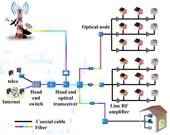 There has been an extensive deployment of communication media by cable TV providers. The network mainly comprises coaxial cables which are normally deployed between a central point (optical node) and homes. In addition, a number of optical nodes are connected to a head-end through optical fibers. Therefore, the cable TV operator’s HFC network is a combination of both coaxial cable and fiber. Note that HFC network bandwidth limitations are mainly as a result of the employed coaxial cable [105].