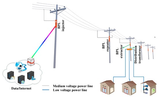 Power Line Communication (PLC) is a concept that is based on the use of electrical wires for data transmission [121]. A typical BPL system is depicted in Figure 3. The main motivation for its deployment is the need for alternative means of offering broadband last-mile access in diverse areas [122,123]. The BPL technology is relevant in this scope due to the existing connection from the power grid to different homes and offices using the grid infrastructure. This saves the need for further investment in the backbone installation [124,125,126]. Note that apart from being used for electrical power transmission, it can be also employed for the transmission of additional audio (speech and music) and video signals. Based on this, different applications such as in-home automation, broadband Internet access, broadband LAN connectivity, smart city, wireless power transfer, automatic remote metering, telemetry, in-vehicle communications, and other transport systems can benefit from PLC network [121,126,127,128].
