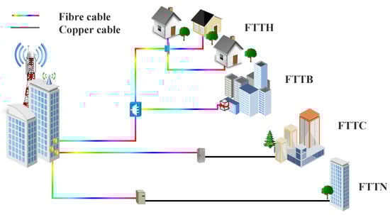 Moreover, some of the existing optical broadband network architectures are significantly addressing the network performance bottleneck through progressive service delivery in close proximity to the customers. Furthermore, the generic term for describing some variants of fiber-based broadband network architecture is FTTx. A typical FTTx architecture is shown in Figure 4. Note that optical fiber can be employed for all or part of the last-mile network local loop. Therefore, the employed FTTx type, like fiber to the node (FTTN), fiber to the building (FTTB), fiber to the cabinet (FTTC), fiber to the premise (FTTP), and FTTH, is majorly determined by the termination of optical fiber and the copper line with respect to the CO and the CPE [7,143,144].