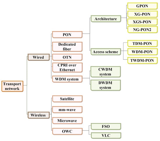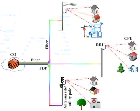 The increasing demand for broadband services has instigated an unprecedented deployment in different wireless technologies. The resulting wireless technologies have different capacities, and the appropriate application of each technology depends on a specific deployment scenario. Consequently, wireless systems have to be well-classified for effective application and performance. In [15,16,17,18,19,20,21,22], wireless systems were classified, and the state of wireless access was discussed. Moreover, how future wireless technologies can support broadband wireless access services was considered. Note that, for ubiquitous and flexible connections, there should be a seamless convergence of wireless and high-speed fiber networks. Therefore, a wide variety of optical transport schemes that can support 5G FWA use cases was considered in [5,8,11,23,24,25,26,27]. A review of the key attributes of the evolving passive optical network (PON) and the fourth-generation (4G) mobile broadband technologies were presented in [28]. Besides, viable ways to leverage both access schemes in order to achieve a hybrid fiber-wireless network were discussed.