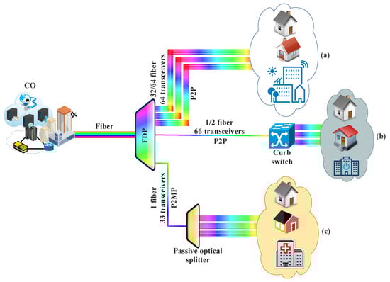 An FTTH network can be implemented based on architectural solutions such as Passive Optical Network (PON), point-to-point (PtP) fiber, and hybrid PONs architectures. As discussed in Section 7, PON is the most widely employed solution, and it enables multiple homes to coexist on shared passive fiber infrastructure. Consequently, all subscribers share the exchange costs, and the cost per subscriber metric is significantly reduced. Apart from the fact that the passive nature of the PON solution helps in reducing network complexity, it also aids in improving the system’s reliability. Similarly, the PtP network, also known as All-Optical Ethernet Network, offers a dedicated line connection from the operator to each subscriber’s home or apartment. This presents a significant benefit over the PON networks. Higher bandwidth with enhanced traffic security can be easily delivered to the subscriber. Moreover, due to its close similarity to the Local Area Network (LAN), the PtP network can effectively leverage the existing LAN equipment and components in order to reduce the network cost. Nevertheless, in PtP networks, powered or active nodes are required for management purposes. This may result in expenditure increase and reduction in the system reliability [16,18]. Another FTTH network architecture is the hybrid PON system in which PtP and PON architectures are combined [18].