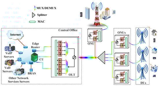- Mikaeil, A.M.; Hu, W.; Ye, T.; Hussain, S.B. Performance evaluation of XG-PON based mobile front-haul transport in cloud-RAN architecture. IEEE/OSA J. Opt. Commun. Netw. 2017, 9, 984–994. [Google Scholar] [CrossRef]