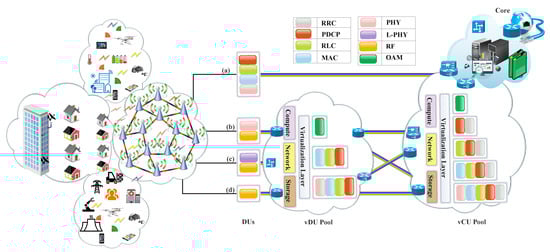 - 3GPP-WG3 R3-162102. CU-DU Split: Refinement for Annex A (Transport Network and RAN Internal Functional Split). Available online: http://www.3gpp.org/DynaReport/TDocExMtg–R3-93b–31676.htm (accessed on 22 August 2021).