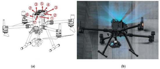 MATRICE M300 RTK six-way sensing system: (a) function annotation, and (b) product in kind [39]. Note: ① front vision system, ② left vision and right vision infrared perception system, ③ left vision and right vision system, ④ top vision system, ⑤ top vision infrared perception system, ⑥ FPV camera, and ⑦ front vision infrared perception system.