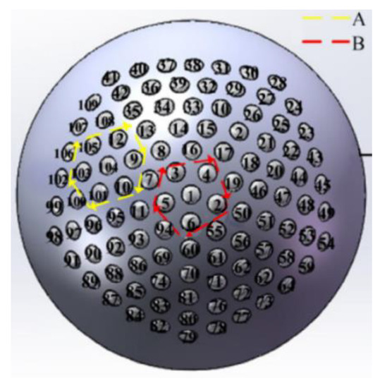 In recent years, the bionic application and research of compound eyes has mainly focused on two aspects: curved array and camera array. However, because the existing curved surface technology is not perfect, the research on curved compound eyes is still in the theoretical stage. Chen [42] used 7 CCD cameras to simulate the compound eyes of flies and designed a bionic compound eye vision system to improve real-time and high-quality image mosaic requirements, which effectively solved the problem of mosaic image misalignment and enhanced the real-time performance of the system. However, this method requires high alignment accuracy of two adjacent sub-images, which is the focus of improvement in the future. Pang [43] imitated the structural characteristics of biological compound eyes and arranged 16 CCD sensors into a curved surface to realize image acquisition without blind spots in the 180 × 75° field-of-view, and to improve the resolution. Aiming at the shortcomings of small drone-borne cameras, such as small field-of-view and narrow imaging range, Yu [44] designed a small size, field angle of up to 106°, micro-miniature bionic compound eye camera. The curved arrangement of the small lens array, optical transformation subsystem, and the data processing unit is composed of three parts. The lens arrangement is shown in Figure 3. In order to increase the overlap rate of the potential fields of adjacent lenses, the lens array in the center A area adopts a regular pentagonal arrangement. The rest of the area is arranged in a hexagonal shape, and the system can collect a target of 0.5 m on the ground at a height of 500 m to achieve a large field-of-view and a high-resolution imaging effect.