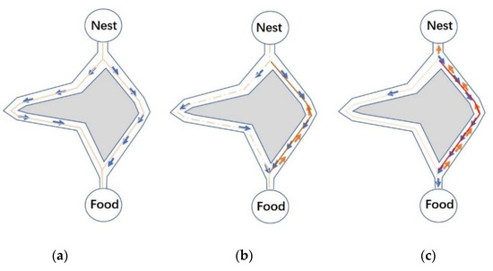 Ant foraging process: (a) early path search, (b) mid-route search, and (c) optimal path.