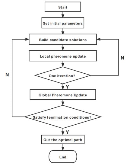 Dorigo et al. [46] first discovered and proposed ant colony optimization. Ants have no vision, but they can find the optimal path. This is because ants release a pheromone along the path they walk, and move towards the path with high concentration according to the pheromone concentration on the way to find the optimal path. The process of ants searching for food is shown in Figure 4. The ant colony algorithm is a bionic algorithm proposed through the collective path-finding behavior of ants, and the algorithm mainly includes probability criteria and a pheromone update mechanism. In the algorithm, the ants will judge the probability of going to the next node based on the values of the initial pheromone and heuristic information. After all ants have completed a traversal, the pheromone concentration on the path will be updated. They repeat the above steps until the optimal path is found. The flow chart of the ant colony algorithm is shown in Figure 5. The ant colony algorithm can quickly find the local optimal solution. Compared with other algorithms, it has better time performance [47], search stability, and high accuracy [48]. However, there is random probability and poor pheromone interference in the operation of the algorithm, which will lead to the low quality of the solution [49], and the algorithm has problems such as insufficient initial information, slow convergence speed, and ease of falling into local optimal solutions [50].
