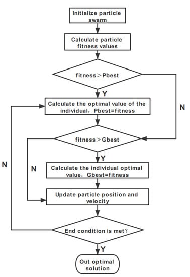 Particle swarm optimization (PSO) is an intelligent algorithm proposed to study the predation behavior of birds [54]. Birds search for food through cooperation among individuals. Each individual is regarded as a particle, with only position and velocity information. The particles follow the optimal particle to search in space. The particle swarm optimization algorithm first sets up the initial particle swarm and searches for the optimal solution through traversal. In each iteration, the particle will update its position and speed through the individual extreme value, Pbest, and the global extreme value, Gbest, and adjust its fitness value to find the optimal solution [55]. The process is shown in Figure 6.