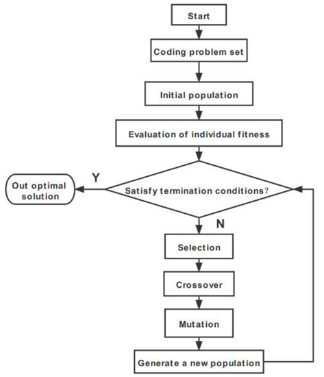 The genetic algorithm is a global optimization intelligent algorithm, which is inspired by Darwin’s evolution theory. Based on the mechanism of natural genetics and natural selection, it uses crossover, mutation, and selection to simulate the process of biological evolution. The core steps in the algorithm mainly include coding, initialization, selection, crossover, and mutation. Firstly, the solution problem is coded and transformed into the solution space of the genetic algorithm. Each code is a feasible solution to form an initial population. Secondly, the individual is evaluated according to the principle of survival of the fittest. Their individual fitness is calculated, and finally, high-quality individuals are selected for cross-mutation to generate a new generation of high-quality solution populations, and the above steps are repeated until the optimal solution is generated [62]. The flow of genetic algorithm operation is shown in Figure 7. The genetic algorithm is a multi-point search algorithm, which can calculate and optimize complex multi-objectives at the same time, avoid falling into local minimum points, and ensure the global optimization ability [63]. The genetic algorithm has fast calculation in the early stage, but large amounts of redundant iterations in the later stage, which is not suitable for real-time trajectory planning [64].