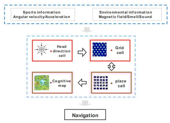 Brain-like navigation has received extensive attention in recent years and has become one of the research hotspots in the field of artificial intelligence. In 1984, Tolman proposed that animals understand the environment through “cognitive maps” [69], and scholars have begun to explore animal brain navigation. In 1971, O’Keefe found place cells in the hippocampus of rats, then head direction cells, grid cells, border cells, etc., were discovered one after another. The mammalian brain has its own intelligent navigation system, which can form a cognitive map for positioning and navigation of the surrounding environment. This is related to the cells in the brain. The navigational cells mainly include head direction cells, grid cells, place cells, and border cells [70]. Head direction cells are responsible for recognizing the animal’s position in the environment, and act as a compass in animal navigation. Grid cells and place cells cooperate to draw a cognitive map. Cells of the brain-like navigation system work together to continuously update the error-correcting cognitive map for precision navigation. The schematic diagram of the mammalian brain navigation system is shown in Figure 8.