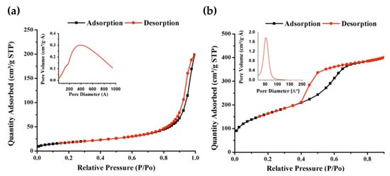 N2 adsorption–desorption BET isotherm for (a) Fe3O4-NP and (b) Fe3O4@MSNs. The insets show the BJH pore size distribution.