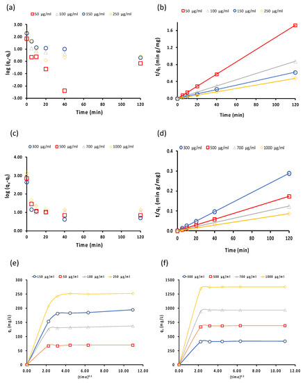 A kinetic study of the removal of studied analytes is crucial to understand and describe the kinetic mechanism of Fe3O4@MSN-QPDMAEMA. Each dye (14 mL) was placed in a 15 mL centrifuge tube of fixed initial concentrations, followed by the addition of 10 mg of Fe3O4@MSN-QPDMAEMA, and the mixture was shaken at 25 °C for different time intervals. The data were then fitted with pseudo-first-order [65,66,67] and pseudo-second-order kinetic models [68] (Figure 9a–d). Along with these two models, the intraparticle diffusion model was also studied to investigate the process of the sequestration of analytes from aqueous solution onto SNPs, (Figure 9e,f). It can be shown that the uptake data of both dyes by the adsorbent fitted well with the pseudo-second-order model, indicating an inclination toward chemisorption. This implies that the rate of the analyte’s uptake depends upon the adsorption capacity and not the concentration of adsorbate [69].