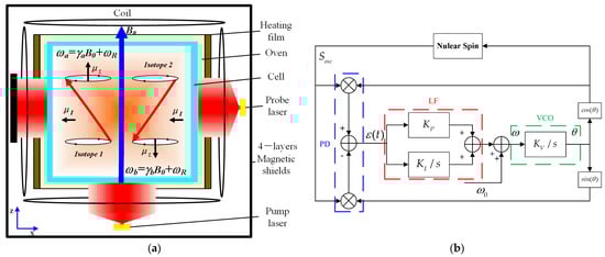 A considerable amount of literature has described the role of magnetic-field measurement [13,14,15,16]. According to [13], a 1°/h bias corresponds to a magnetic field error of 100 fT given the gyromagnetic ratio for 129Xe of 2π∙10 MHz/T. In the earliest proposals for NMRRS, the magnetic field could not be measured, which results in a severe limitation on accuracy by uncertainties in the magnitude of the magnetic field. By introducing a second set of resonant nuclei isotopes, the literature [17] makes it possible to measure the magnetic field. A variant with four frequencies available for measurement is mentioned in [18]; however, it is not commonly applied due to the stringent requirement for the two steady, equal, and opposite magnetic fluxes. Thus, the two-isotope (129Xe and 131Xe) solution of magnetic field measurement is mainly considered in this paper.
