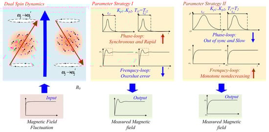 In this subsection, two strategies were proposed based on the PLL method. Analysis of the strengths and weaknesses of both strategies were given. As is shown in Figure 3, the two resonant nuclear oscillators with frequencies ( and ) are maintained by PLLs. The magnetic field fluctuation changes the Larmor frequencies of the nuclei, which makes the spin oscillators off-resonant. Under the control of PLL, the spin oscillators return to resonant in a new set of frequencies ( and ).