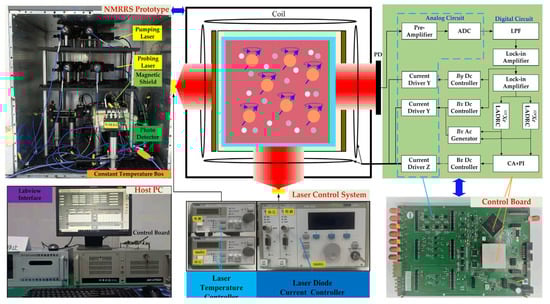 As is shown in Figure 4, the signal is parametrically modulated at the alkali Larmor frequency (100 kHz range). The input signal is demodulated (32-bit CORDIC rotate algorithm) by a lock-in amplifier (LIA) to obtain the oscillation signal. By a low-pass filter, the oscillation signals of the Xe isotopes are separated and the phase of the oscillation signals are detected by the phase detector (32-bit CORDIC vector algorithm). The magnetic field estimation method based on the traditional PLL controller and the proposed synchronous estimation method based on LESO are implemented in the FPGA. The PLL or LADRC will keep the Xe isotopes resonant with the Larmor frequency by adjusting the frequency of the numerically controlled oscillator (NCO). Additionally, the estimation algorithms can obtain the magnitude of the magnetic field according to the frequencies of the NCO. The photograph of the experimental platform which consists of the control system and the experimental prototype is shown in Figure 4.