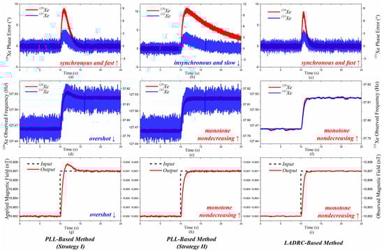 It is obvious that the PLL-based method with parameter strategy I controlled the phases of two isotopes coherently as is shown in Figure 5a. In Figure 5b, the PLL-based method with parameter strategy II performed weakly on synchronization because the lifetime of the 129Xe is longer than the 131Xe. The results in Figure 5d,g show that great overshot appeared in the test of the parameter strategy I, which leads to great transient errors in the magnetic field measurement. Figure 5e,h show that strategy II has a great advantage in frequency observation. The overshot was suppressed and a monotone nondecreasing step response was obtained.