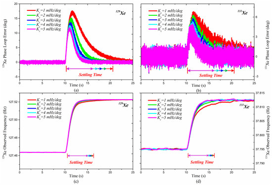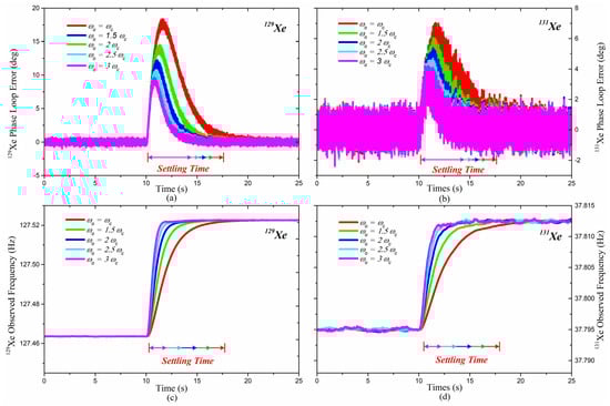 In Figure 7, the parameter was fixed to 2.16 Hz, and the parameter was set from 1~5 mHz/deg. A step input signal (5 nT) was added to the magnetic field of the z-axis, and the responses of both loops were recorded. Figure 7a,b are the phase-tracking response signals, Figure 7c,d are the frequency-observing response signals of both isotopes, and Table 3 is the settling times of the experiments. As is shown in the test results, played a dominant role in the phase-loop response, but not in the frequency-loop.