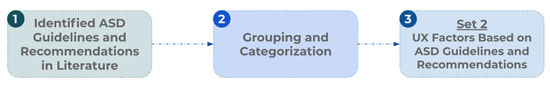 We followed a three-step process to define UX factors for people with ASD based on ASD guidelines and recommendations: (1) the compilation of articles that propose and/or use design guides and/or recommendations, (2) grouping and categorizing design guidelines and/or recommendations based on their similarities, and (3) the proposal of a second set of UX factors for people with ASD.