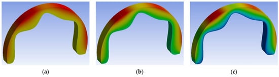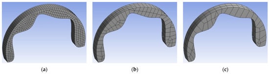 Images of meshed solid models with different numbers of nodes and elements: (a) mesh model-1, (b) mesh model-2, and (c) mesh model-3.