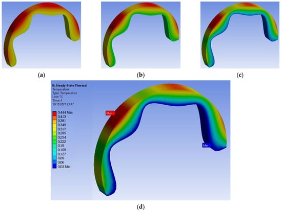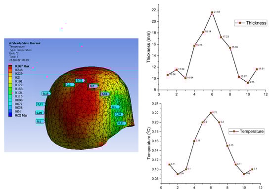 Since the modeled solid object contains experimental applications for the bone structure of the human skull, it was designed with different thicknesses. Temperature differences were analyzed by applying different amounts of heat to the interior and exterior surfaces. The temperature value of the inner surface was accepted as 0 °C. This process, which is applied to solid models, can also be applied to living human skulls (see Section 4). However, no direct thermal application is made to the skull of the living person. First, CT images taken from the person are converted into a model for thermal analysis. The internal and external surface temperature values of the skull that is turned into the model are unimportant, because at this stage, the focus is on the internal–external surface temperature differences. In this case, choosing 0 °C or a different value for the inner surface makes no difference. For the convenience of mathematical operations, the inner surface was accepted as being 0 °C. Thus, the heat value on the outer surface will directly provide the temperature difference value.