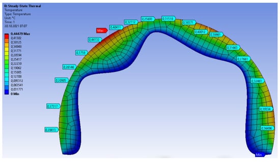 In Figure 6, the temperature values and the highest and lowest values of the points marked on the model are shown. In Figure 7, the distances of the marked points from the inner surface are given. As can be seen from Figure 7, the temperature difference changes in direct proportion to the thickness of the object.
