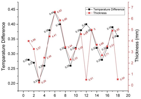 On the basis of the possible values of , the expression can be obtained. Thus, a linear regression model can be drawn using the estimated values. Figure 8 shows the linear regression model between temperature difference and object thickness. Thus, when any point on the outer surface of the designed skull-like model is marked, the thickness value corresponding to the point marked can be found using the least-squares method.