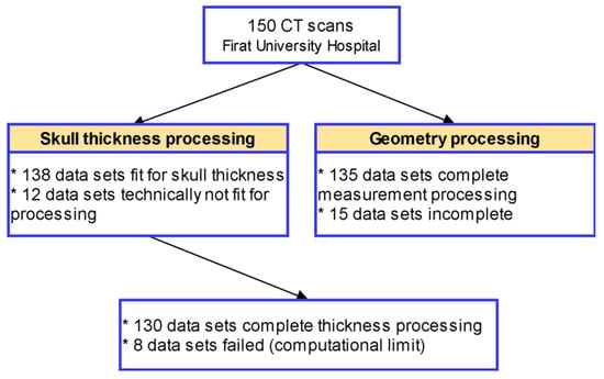 Current methods for measuring skull thickness in adults are based on taking measurements using a saw at predetermined points in the skull. However, these methods may not give correct information about skull thickness. To address this issue, a different method was proposed to measure the skull thickness of adults using standardized anatomical points []. In another study, an automated approach to measuring skull thickness using CT images to determine soft tissue locations was presented []. In addition, a method for measuring skull thickness using after-death skull CT images of children was developed []. However, since the skull growth rate in children is extremely variable in this method, it is very difficult to determine a standard point from which to start the measurements. The finite element model of the skull is used to study the biomechanics of traumatic brain injury, and it is highly dependent on head geometry. In a study conducted using this information, a skull database containing information on the age-specific development of children’s skulls was created with the help of the finite element model [].