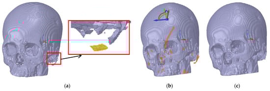 (a) Unconnected mesh body. (b) All unconnected mesh bodies (orange color). (c) Skull without unconnected mesh body.