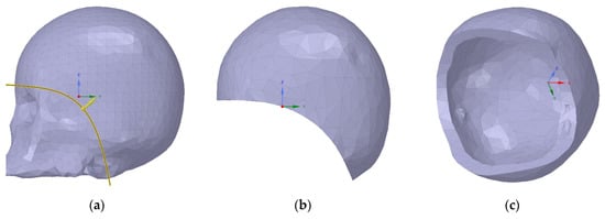 Access to the inner surface is necessary in order to determine the skull’s thickness. Therefore, as seen in Figure 12, the facial region of the skull is removed by drawing a curve from the forehead to the neck. Thus, access to the meshed inner region is provided.