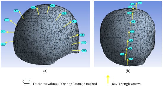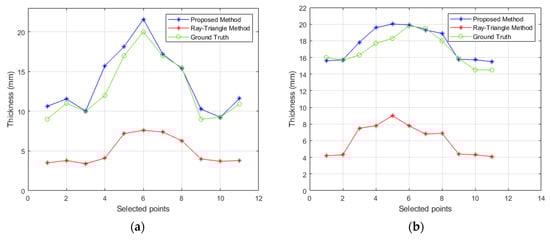For the purpose of comparison with the proposed method based on thermal analysis, the Ray-Triangle method [,], which is able to calculate the thickness in 3D objects, was applied to the manuscript data. Random points were selected along the geometric curve drawn from the frontal bone to the parietal bone and the geometric curve drawn from the left temporal bone to the right temporal bone. First, the coordinate values of the selected points in 3D space were recorded. The Ray-Triangle method was used to pass through these points. The skull thickness values obtained by the Ray-Triangle method are shown in Figure 16. The skull thickness values of the proposed method and the Ray-Triangle method were compared.