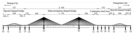 Changtai Yangtze River Bridge connects Changzhou City and Taixing City and is a rail-cum-road cable-stayed bridge with asymmetric layout of double towers and double cable planes. The upper layer of the bridge is a two-way six lane expressway, and the lower layer is an intercity railway and a two-way four lane ordinary road. With a main span of 1176 m, the main navigational channel bridge is the largest cable-stayed bridge in the world and the overall layout is shown in Figure 1 [15,16].