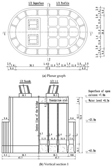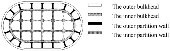 The round end plane shape was also adopted under the main tower of Changtai Yangtze River bridge. Moreover, the stepped caisson foundation was created with small top and large bottom shape. For the stepped caisson foundation, the bottom surface is 95 m long cross the bridge, 57.8 m wide along the bridge, and the radius is 28.9 m for the circular end. For the top surface, it is 77 m long, 39.8 m wide, and the radius is 19.9 m for the circular end (Figure 2). The total height of the caisson foundation is 72 m, of which the lower step is 43 m, the upper step is 29 m, and the target sinking elevation is −65 m. For the caisson foundation, the steel shell concrete is used from top to bottom, which is the largest underwater steel caisson foundation in the world. The caisson foundation contains 36 compartments, including 18 inner compartments and 18 outer compartments. The names of four typical areas are shown in Figure 3, and they are respectively inner partition wall, inner bulkhead, outer partition wall and outer bulkhead.