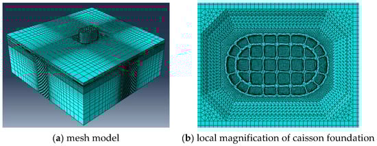 Hexahedral element C3D8R and tetrahedral secondary element C3D10 were used in the finite element calculating model. Due to complex structure of caisson foundation, tetrahedral element C3D10 was adopted. Figure 10 is the mesh model of the caisson foundation, in which there are about 550 thousand nodes and 420 solid elements.