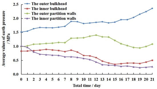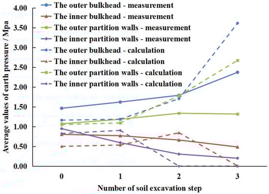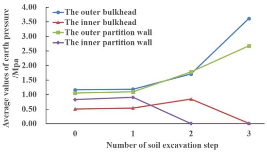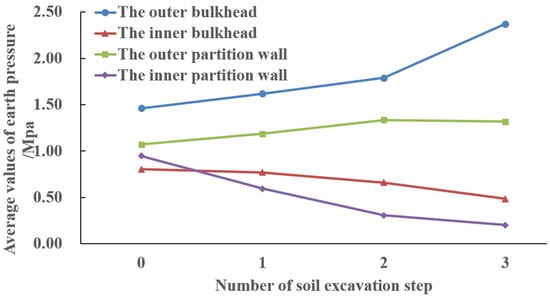 After soil excavation step 1, the earth pressure of the outer bulkhead and the outer partition wall area slightly increased by 0.202 MPa and 0.143 MPa, respectively. The earth pressure of inner bulkhead remained basically unchanged, and the earth pressure of the inner partition area decreased by 0.388 MPa. For soil excavation step 2, the earth pressure of the outer bulkhead and the outer partition wall area increased continually, and the earth pressure of the inner bulkhead and inner partition wall area slightly decreased, which is caused by soil excavation from the inner compartment. After soil excavation step 3, the earth pressure of outer bulkhead significantly increased to 2.359 MPa, while the earth pressure of the inner partition area decreased to 0.273 MPa because of soil excavation in this area, and the earth pressure of outer partition wall and outer bulkhead area are, respectively, 1.081 MPa and 0.502 MPa.