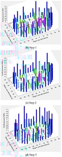 From Figure 12 and Figure 13, the distribution characteristics of earth pressure at the foot blade are closely related to the shape and distribution area of the foot blade. Before soil excavation, the maximum of the earth pressure at the foot blade is about 1.25 MPa, occurred in the outer bulkhead. Meanwhile, the earth pressure in the inner bulkhead area was the smallest, which is in the range of 0.25 MPa to 0.75 MPa. After the first step of soil excavation, the earth pressure in the other three areas except inner partition area increased basically within 0.1 MPa because of soil excavation in the inner compartment. After the second step of soil excavation, the earth pressure under the foot blade in the inner partition was less than 0.05 MPa, which is basically hollow, and the earth pressure in the other three areas was significantly increased, especially in the outer partition wall and outer bulkhead. For the last step of soil excavation, the earth pressure of outer partition and outer bulkhead was further increased, and the earth pressure in the outer bulkhead increased greater than that in the outer partition area.