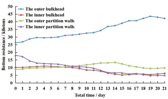 After the first stage of soil excavation, the elevation of the foot blade in the outer bulkhead area was −32.95 m, and the foot blade was buried into the soil by 2.95 m, hence, the side friction resistance can be ignored during the first stage of soil excavation. The end resistance can be calculated using the total weight and buoyancy of caisson foundation, and then, the end resistance in each area of caisson foundation can be also obtained based on the earth pressure and shape of the foot blade (Equation (2)). Figure 19 showed the variation and distribution of end resistance in each area during soil excavation procedure.