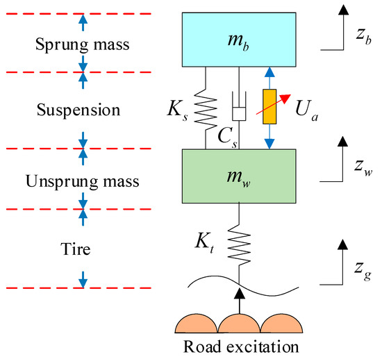 Where and are the sprung mass and the unsprung mass, is the suspension stiffness, is the tire stiffness, is the suspension damping, is the active control force of suspension, when , it is passive suspension.