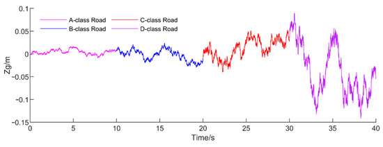 A-class to D-class roads are recorded for 10 s in turn to build this composite road. The time domain response curve is shown in Figure 3.