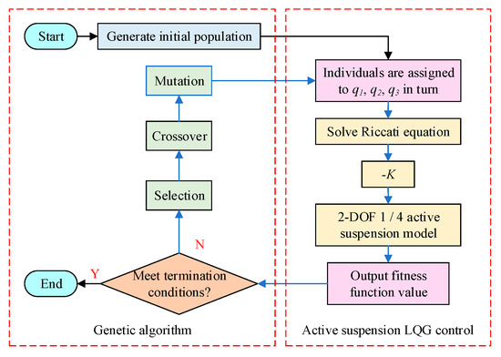 - The values of individuals in the population are assigned to the weighting coefficients , , and of the LQR controller in turn. The optimal gain feedback matrix is solved by Riccati Equation (10), and then the optimal control force is solved by Formula (12). Then the control force is acted on the active suspension model, and the RMS values of the three performance indexes are calculated;