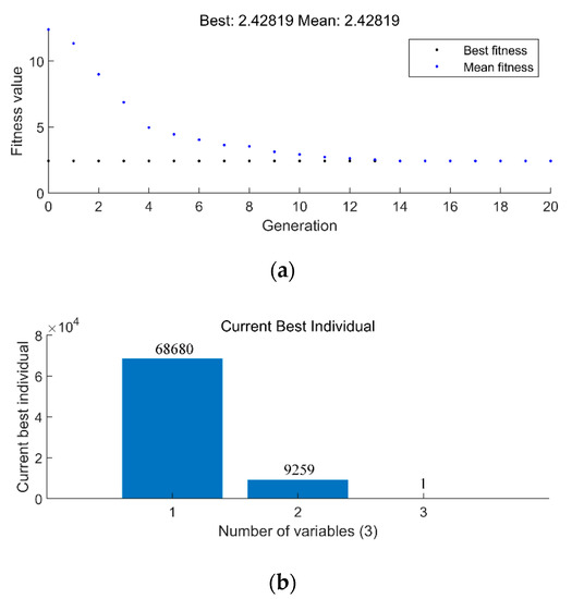 In the optimization process of GA, to guarantee the control effect of BA and reduce the number of iterations, the weighting coefficient of BA is set to 1. We took the optimization results of the literature [14] as references and expanded the range of weighting coefficients and intervals as larger as possible to ensure the reliability of the optimization search results. For GA, the main parameters are the population size, the number of interactions, the crossover fraction, and the mutation fraction. We set these parameters of GA using the values set in the literature [16,17] as references. As can be seen from Figure 5a, the value of the fitness function has reached the optimum at the 12th iterations. Therefore, it is sufficient to set the generations and termination generation to 20. Furthermore, the selection of crossover fraction and the genetic fraction is crucial to the performance of genetic algorithms. The larger the crossover fraction, the faster new individuals are generated. However, when the crossover fraction is too large, there is a possibility of the genetic pattern being destroyed, making the structure of individuals with high fitness destroyed. Additionally, if the crossover fraction is too small, the search process is slow, and the search time is prolonged. For the mutation fraction, if its value is too small, it is not easy to generate new individuals. If the mutation fraction is too large, the randomness of the genetic algorithm search is too large. Therefore, we used the values in the literature [16,17] as references, and the two parameters were fine-tuned to simulation. Finally, the crossover fraction is set to 0.4 and the mutation fraction to 0.05. The parameters of the GA are shown in Table 2.