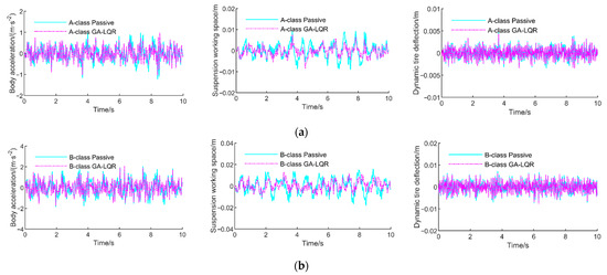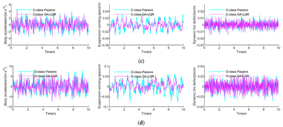 Comparison curves of time domain response for two suspensions (passive suspension and active suspension based on GA-LQR) at four road classes: (a) A-class road; (b) B-class road; (c) C-class road; (d) D-class road.