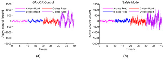 As can be seen from Table 11 and Table 12, the RMS values of active control force and power consumption in the same mode increase with the road roughness. For the same road input, the active force of safety mode, comprehensive mode, and comfort mode increases in order, which is related to the value of the weighting coefficient of each performance index for different performance modes. With the improvement of comfort requirements, the suspension is required to be soft, so the active control force needs to be larger. The force consumption using GA-LQR is similar to the safety mode but better than the other two modes.