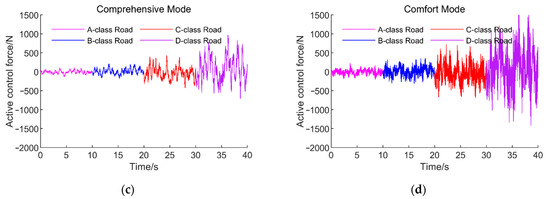 Time domain response curve of active control force. (a) GA-LQR control; (b) safety mode; (c) comprehensive mode; (d) comfort mode.
