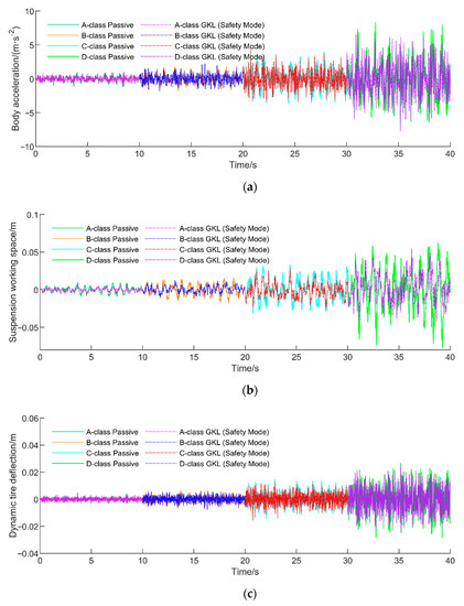The optimal solution of weighting coefficients of safety mode is as follows: , , . The comparison curves of time domain response of passive suspension and safety mode are shown in Figure 12a–c, and the RMS values of each performance index are shown in Table 12.